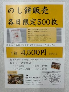 搗き立ての「のし餅」を今年は、500枚数量限定にて販売いたします。 厳選した上質な水稲国産もち米100%にてご用意いたします。 熱さが残るやわらかい状態で当日販売いたします。(搗きあがり2.9kg)金額 4,500円(税込) 各日、限定500枚の販売となります。 販売日2025年12月26日 12時~17時 2025年12月27日~29日 9時~17時